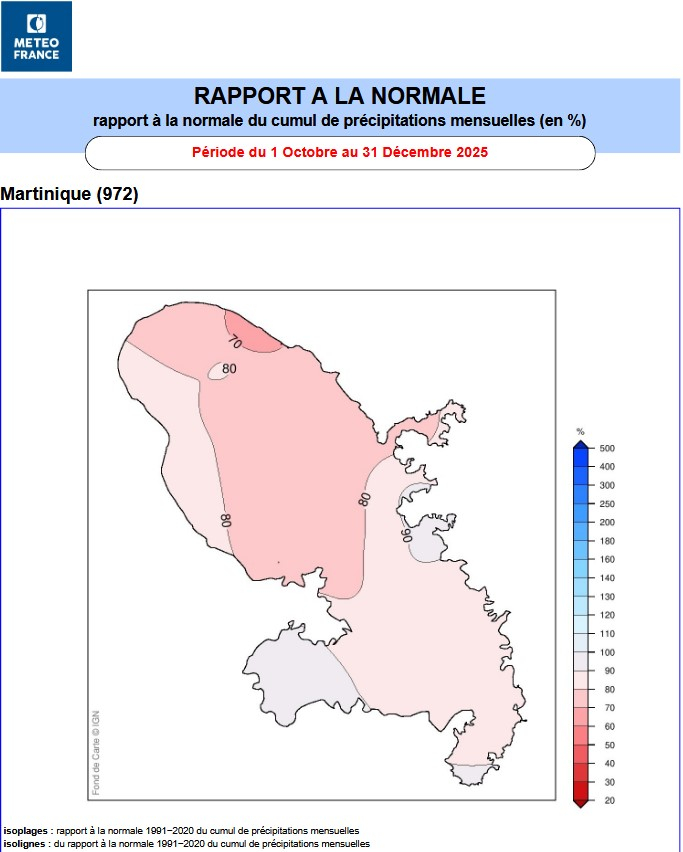 Décembre : Jusqu’à 40 % de manque dans le nord. Le centre est quasi à la norme avec un manque de 30 % entre Manzo et St-Esprit. Le sud, quant à lui, est arrosé normalement avec un excédant de 20 % du côté de Rivière Pilote.