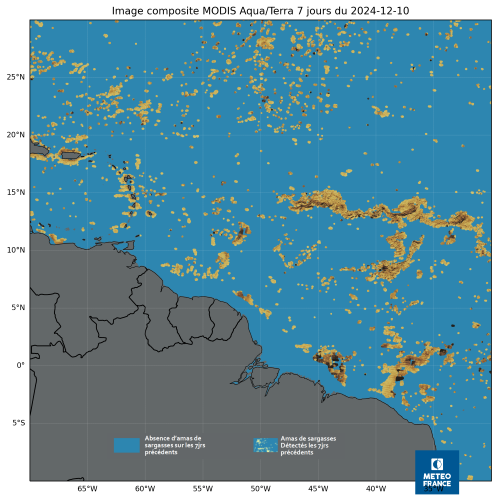 Toutefois, face à cette incertitude, la surveillance continue reste cruciale. L’observation satellitaire, comme celles obtenues par les images MODIS Aqua/Terra ainsi que les géo-indicateurs d’activité de sargasses (voir bulletin), permettent de suivre et d’anticiper les développements de la situation.