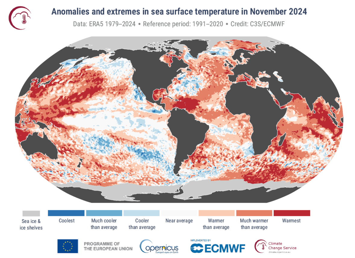Figure 3 : Anomalies et extrêmes de la température de surface de la mer pour novembre 2024. Les catégories de couleurs font référence aux percentiles des distributions de température pour la période de référence 1991-2020.