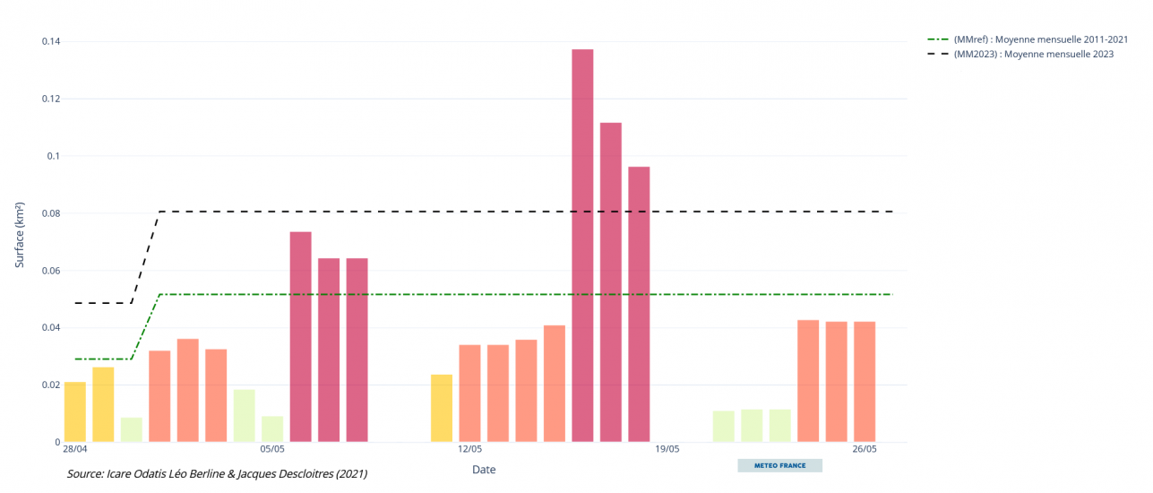 Le graphique ci-dessous nous permet de quantifier la présence d’algues sargasses traversant une des zones de surveillance d’intérêt, au cours des dernières semaines. Les surfaces journalières observées dépassent la moyenne référence établie sur la période de 2011 à 2021, cela pourrait signifier une augmentation inhabituelle de la quantité de sargasses au cours des prochains mois.