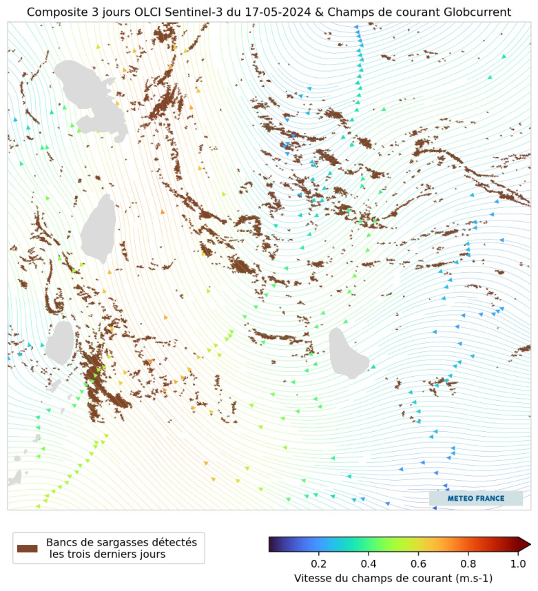 L’image ci-dessous, représente une composite de 3 jours des observations du capteur OLCI de Sentinel-3 du 17 mai 2024, superposée aux champs de courant Globcurrent. Les bancs de sargasses détectés y sont indiqués en marron. Cette image illustre clairement la distribution des sargasses dans les eaux entourant la Martinique et les courants marins qui influencent leur dérive.
